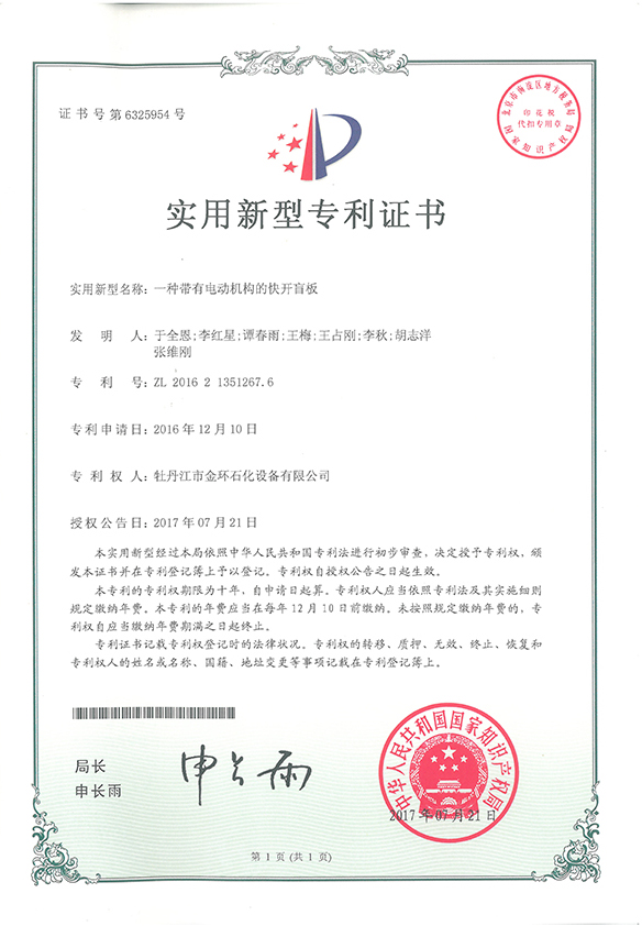 一種帶有電動(dòng)機(jī)構(gòu)的快開(kāi)盲板實(shí)用新型專(zhuān)利證書(shū)ZL 2016 2 1351267.6