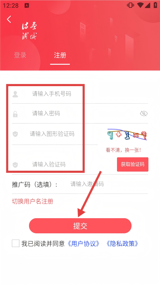 4、在注冊信息填寫頁依次輸入手機(jī)號碼、密碼、圖形驗(yàn)證碼、驗(yàn)證碼,勾選同意《用戶協(xié)議》《隱私政策》后點(diǎn)擊【提交】,完成賬號注冊。