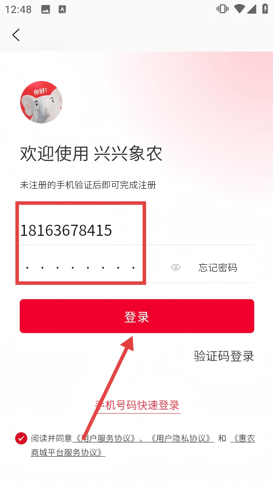 4、在該頁面輸入手機(jī)號(hào)、密碼,勾選同意協(xié)議后點(diǎn)擊【登錄】,完成賬號(hào)登錄。