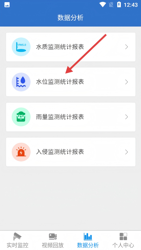 2、在數(shù)據(jù)分析界面,選擇【水位監(jiān)測(cè)統(tǒng)計(jì)報(bào)表】,進(jìn)入水位監(jiān)測(cè)地點(diǎn)列表頁。