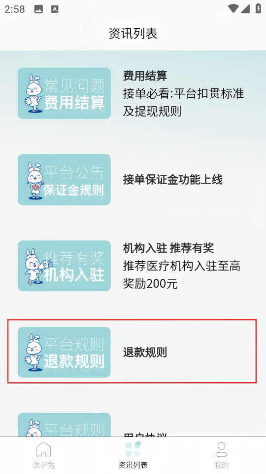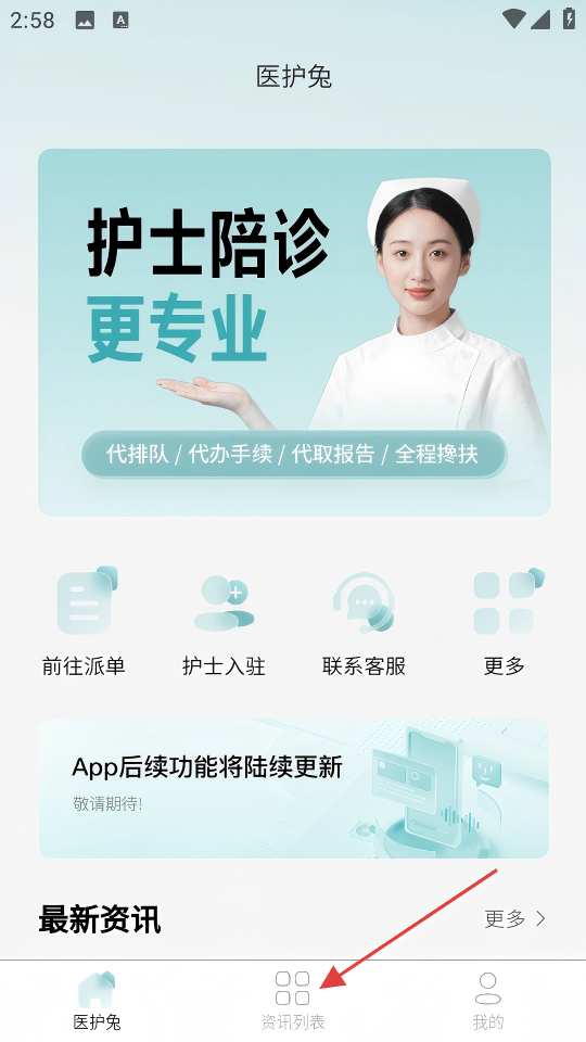 2、在【醫(yī)護(hù)兔】主界面,點(diǎn)擊底部導(dǎo)航欄的【資訊列表】。