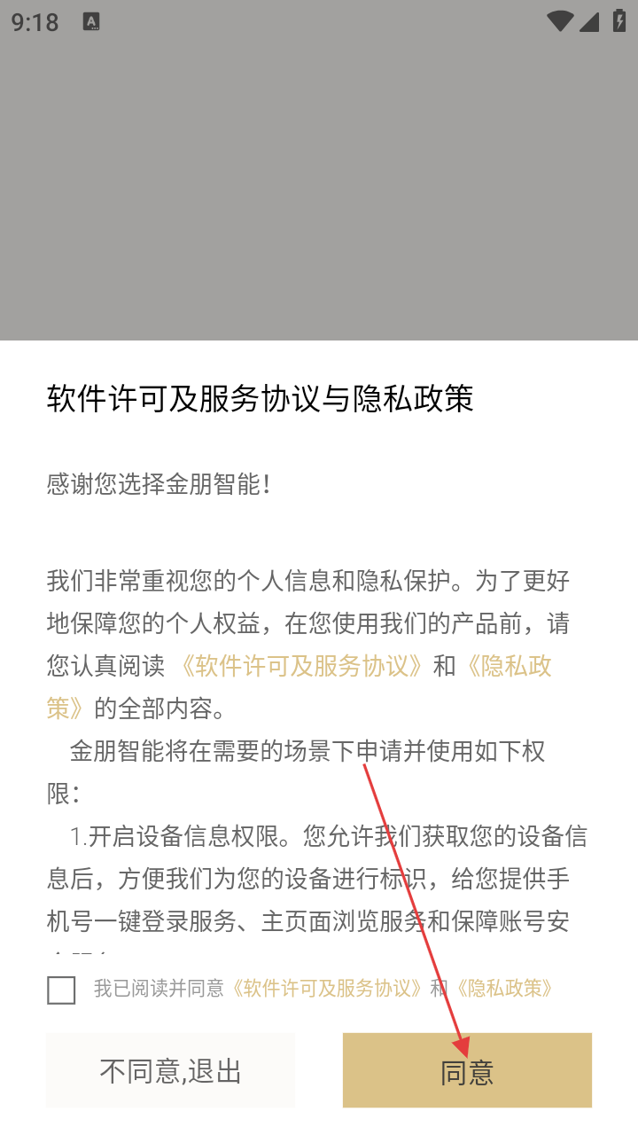 1、首次使用金朋智能,需閱讀【軟件許可及服務(wù)協(xié)議】和【隱私政策】,勾選同意后點(diǎn)擊【同意】按鈕,進(jìn)入登錄環(huán)節(jié)。