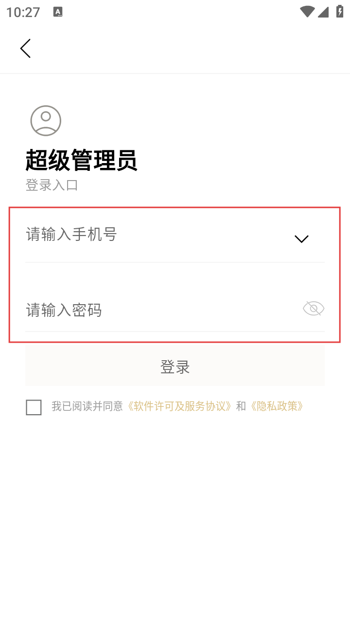 3、在超級(jí)管理員登錄界面,找到【請(qǐng)輸入手機(jī)號(hào)】和【請(qǐng)輸入密碼】輸入框,準(zhǔn)備填寫(xiě)登錄信息。