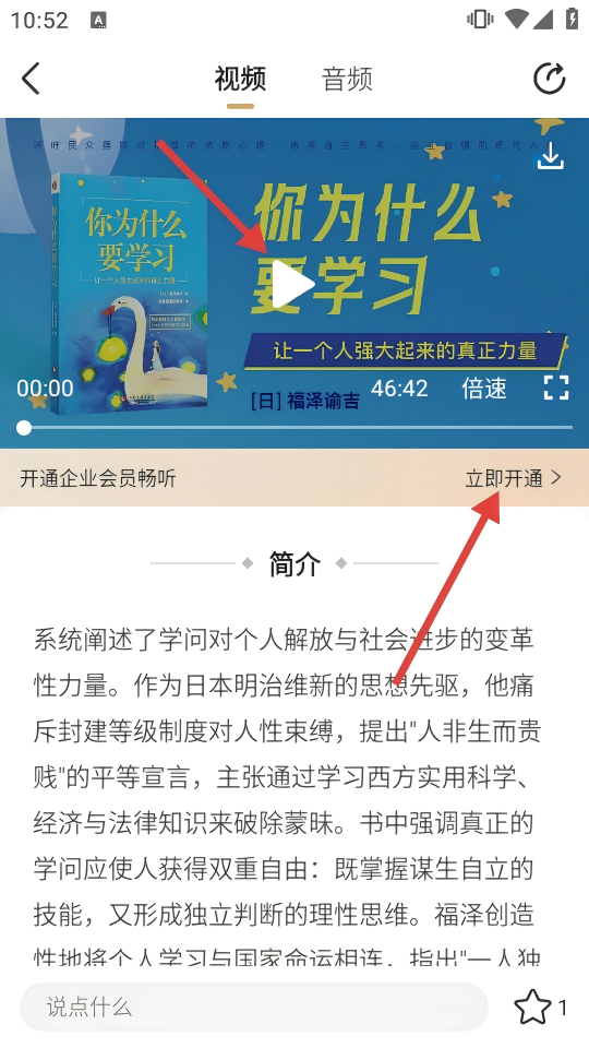 3、若想開通會員暢聽,點擊頁面上的【立即開通】;若要直接學習,點擊播放按鈕開始課程學習。
