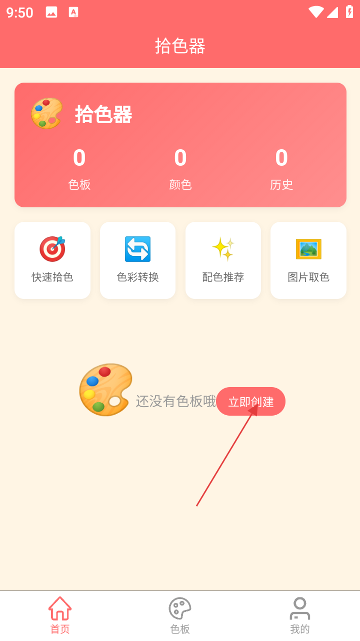 1、在拾色器首頁,點擊【立即創(chuàng)建】按鈕,可進入色板創(chuàng)建相關界面。