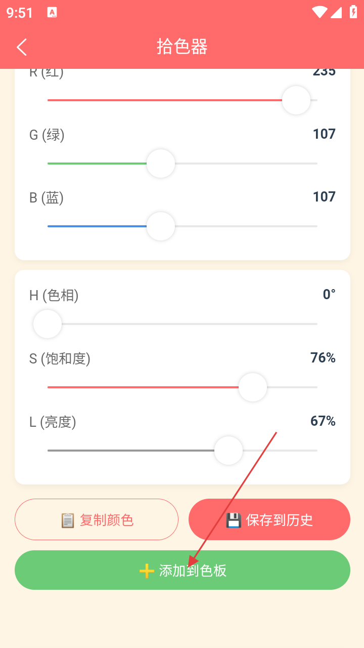 2、進入色板創(chuàng)建界面后,調節(jié)R、G、B等參數(shù)選擇顏色,再點擊【添加到色板】。