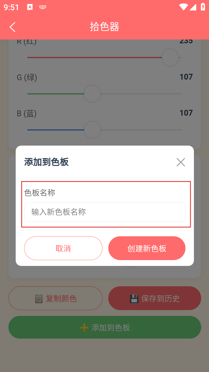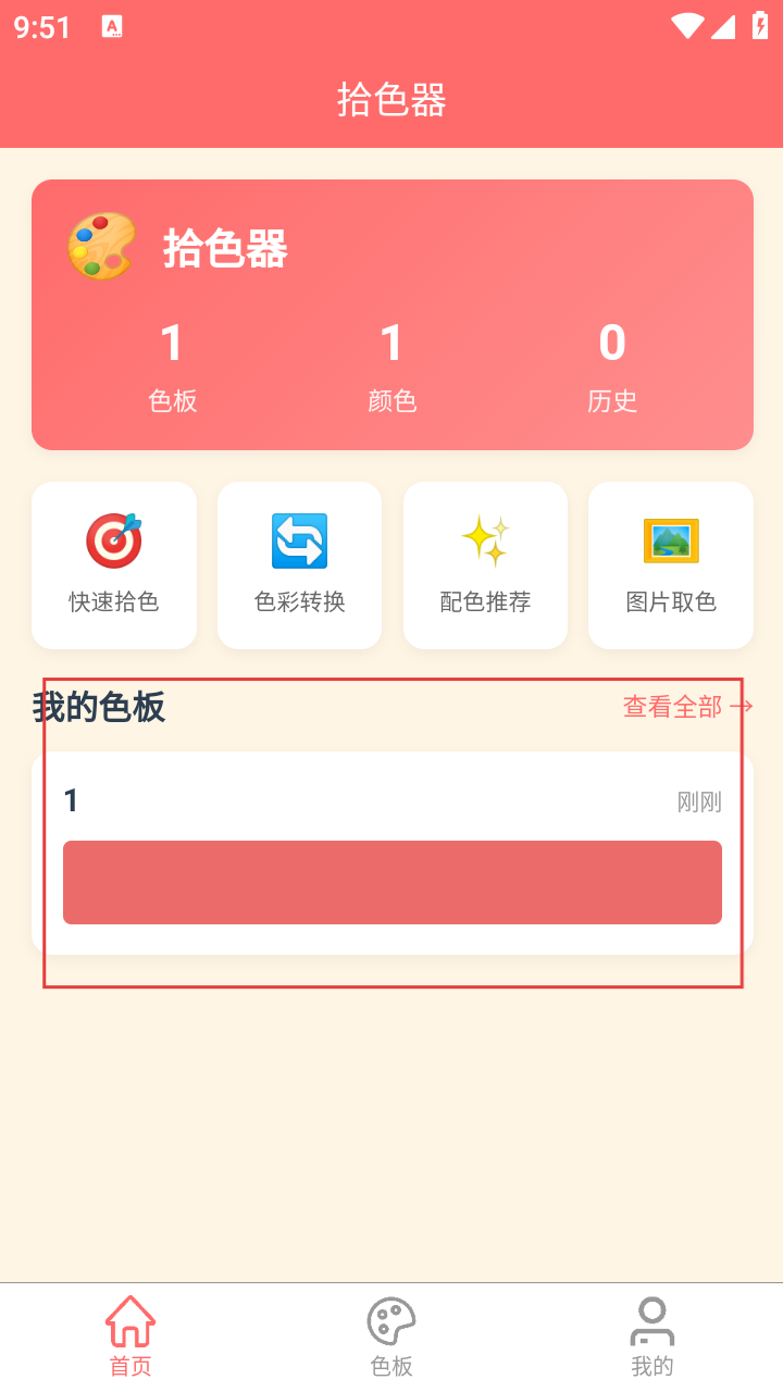 4、創(chuàng)建完成后,回到拾色器首頁,可在【我的色板】區(qū)域查看已創(chuàng)建的色板。