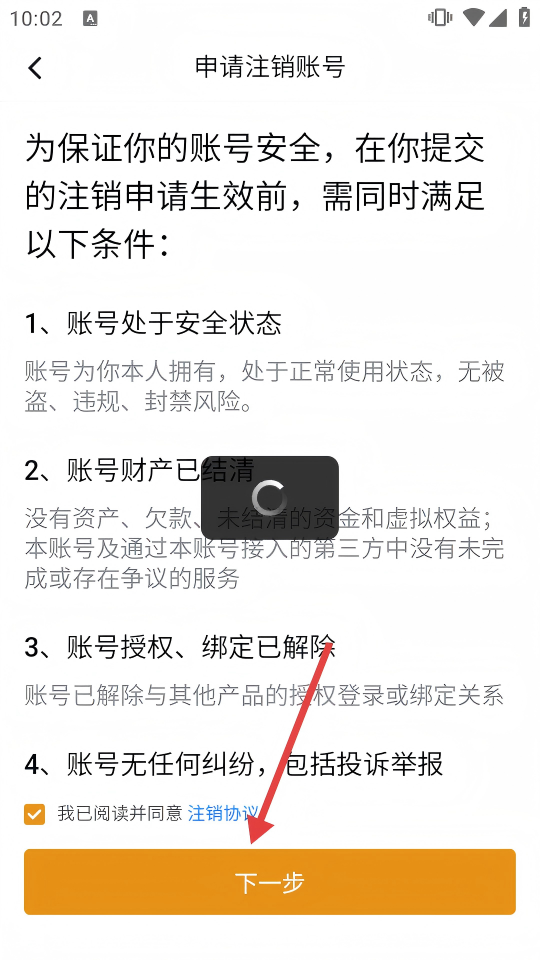 4、進(jìn)入“申請注銷賬號”頁面,確認(rèn)滿足注銷條件,,點(diǎn)擊【下一步】,推進(jìn)賬號注銷流程。