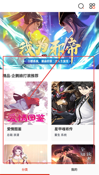 1、在分類(lèi)頁(yè)面,可看到推薦的漫畫(huà),比如:點(diǎn)擊【愛(ài)情圖鑒】,即可進(jìn)入該漫畫(huà)的詳情頁(yè)面。