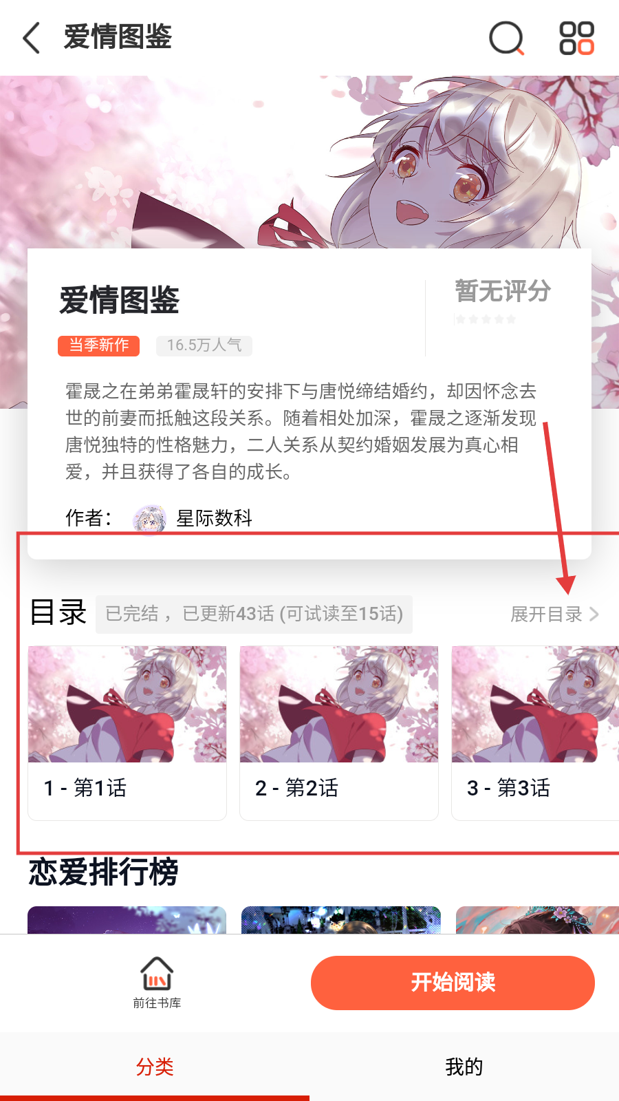 2、進(jìn)入【愛(ài)情圖鑒】詳情頁(yè)后,能看到漫畫(huà)的簡(jiǎn)介與目錄,點(diǎn)擊【展開(kāi)目錄】,可查看更多章節(jié)。