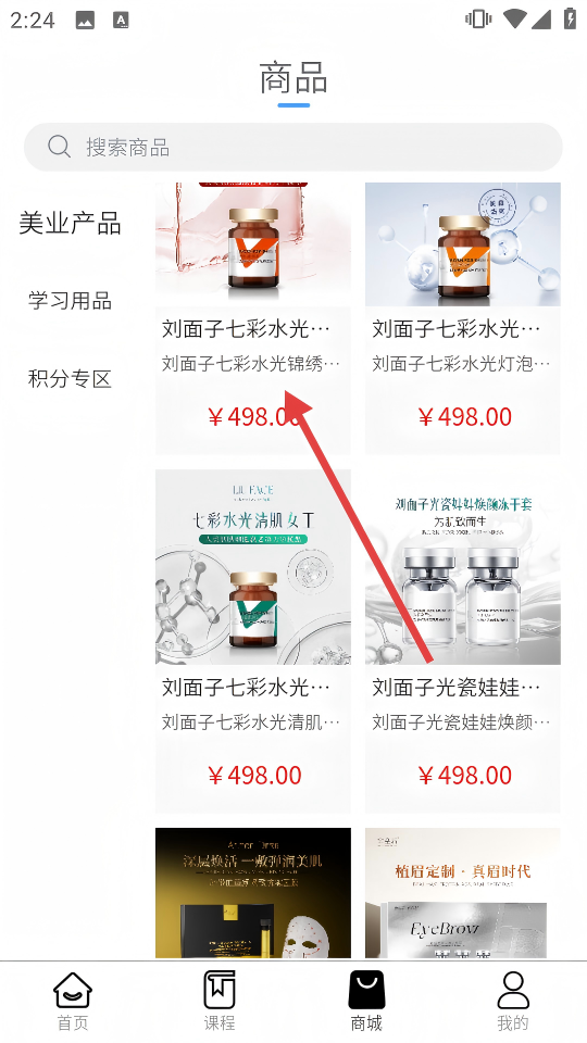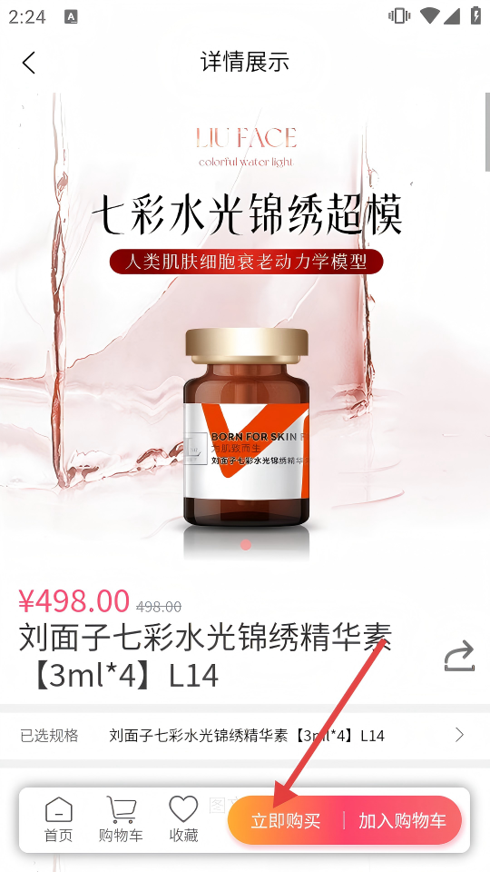 2、在商品列表里,選“劉面子七彩水光錦繡精華素”,進(jìn)入詳情展示頁。