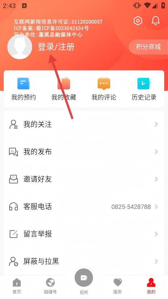2、進(jìn)入APP“我的”頁面,點(diǎn)擊【登錄/注冊】,進(jìn)入登錄注冊界面。