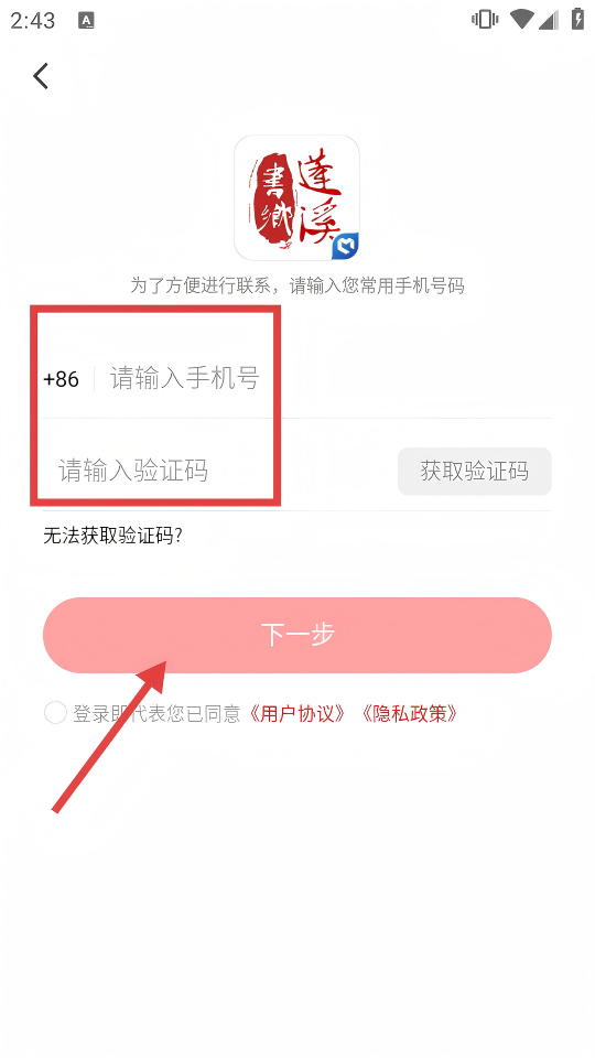 4、在注冊頁面,輸入常用手機(jī)號、驗(yàn)證碼,勾選同意《用戶協(xié)議》《隱私政策》后,點(diǎn)擊【下一步】,完成注冊操作。