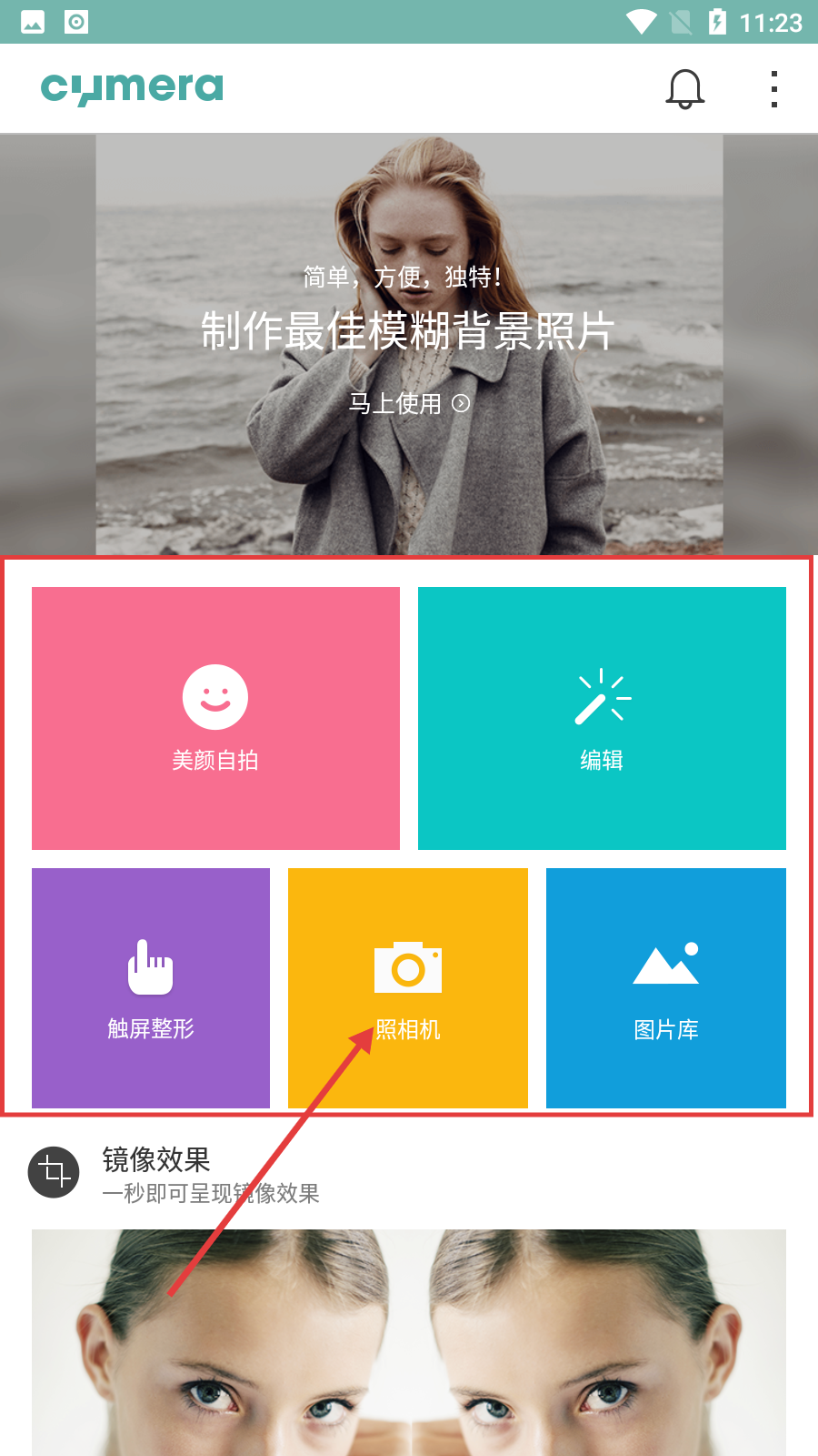 2、進入主界面后,可看到【美顏自拍】【編輯】【照相機】等功能按鈕,點擊【照相機】可進入拍攝頁面。