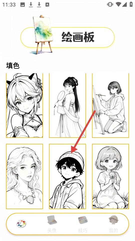 1、進(jìn)入軟件首頁,看到【繪畫板】及填色區(qū)域,挑選心儀的線稿,比如戴帽子的人物線稿。