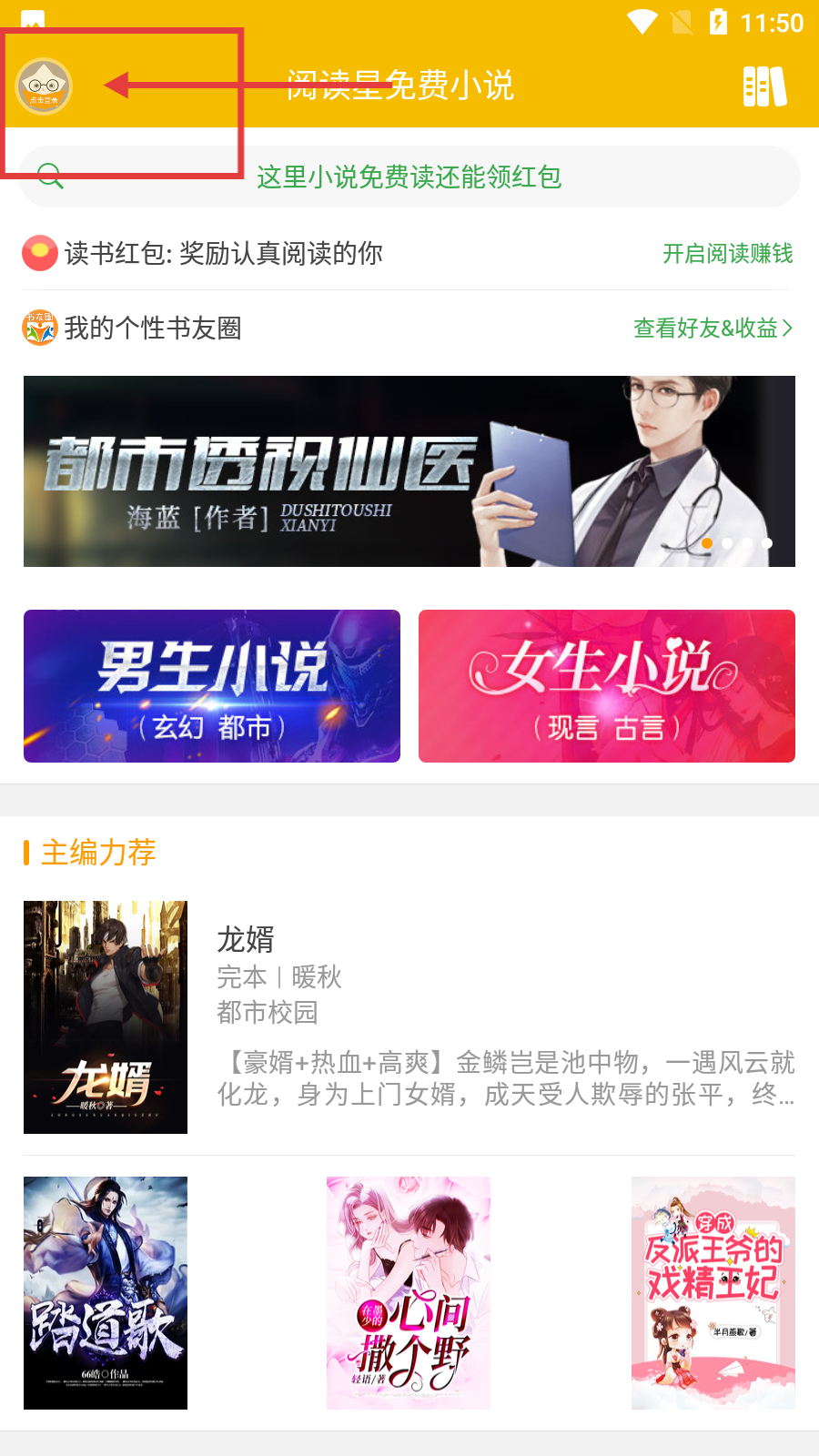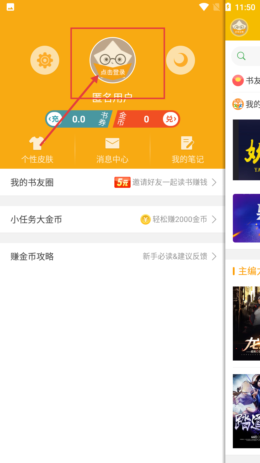 1、進入閱讀星免費小說界面后,點擊左上角【點擊登錄】頭像區(qū)域,可展開包含登錄等功能的側(cè)邊欄。
