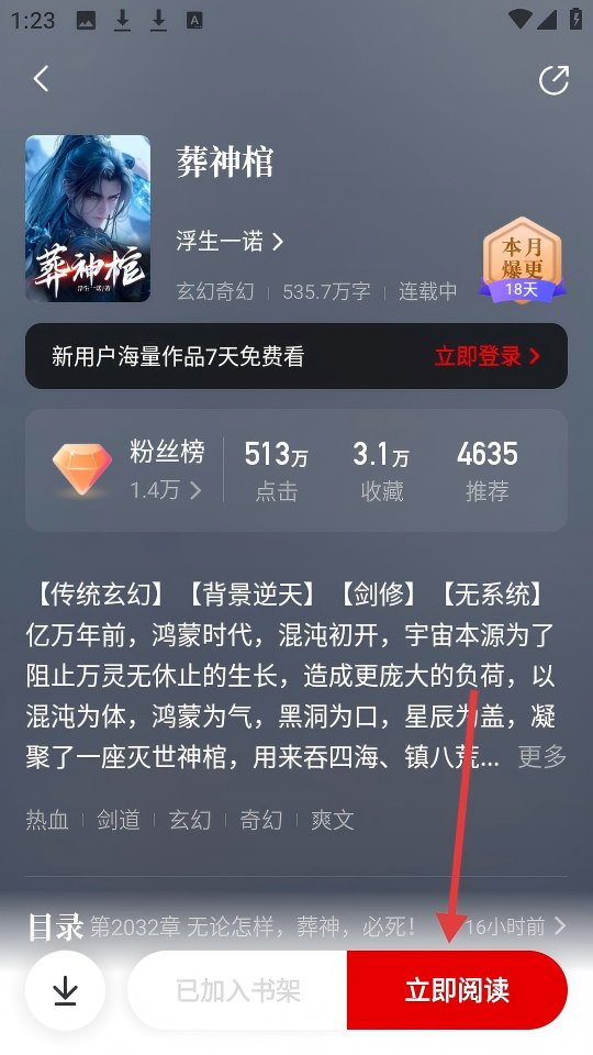 2、點(diǎn)擊【立即閱讀】可開始閱讀《葬神棺》。