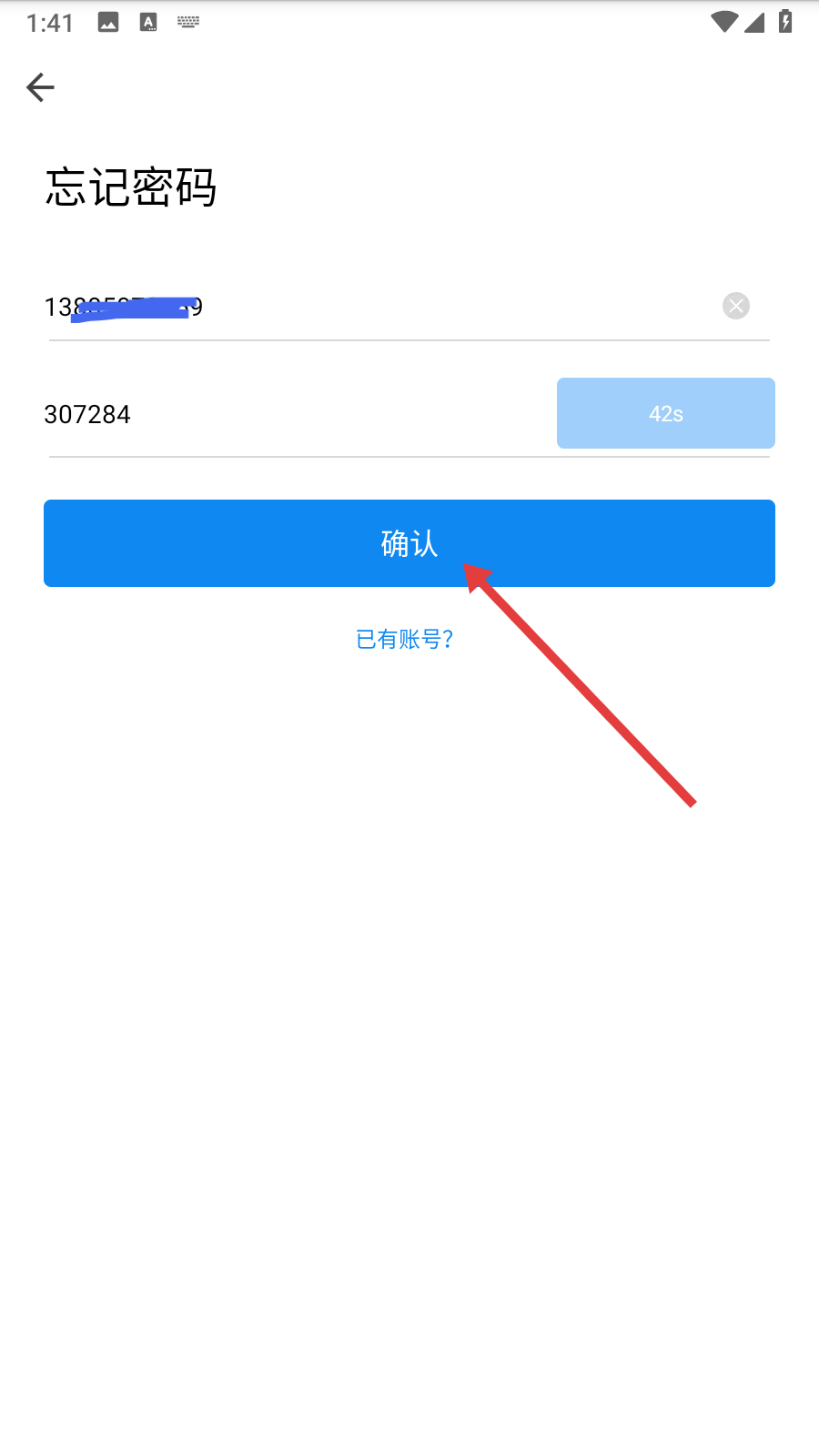 3、在忘記密碼頁面,輸入手機號和驗證碼后,點擊【確認】按鈕。