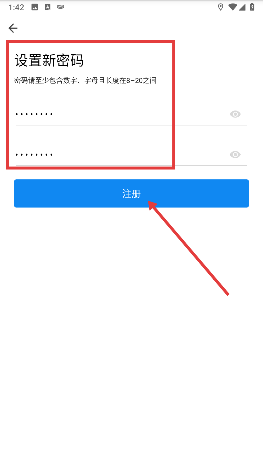 4、在設(shè)置新密碼界面,輸入符合要求的新密碼后,點擊【注冊】按鈕,完成密碼找回流程。