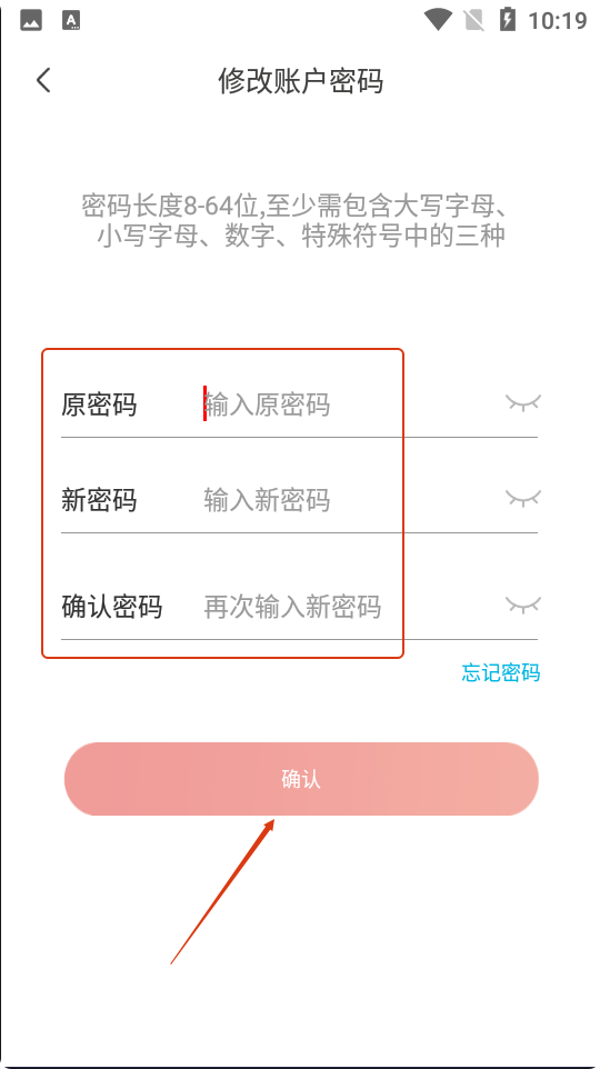 4、在修改頁面輸入【原密碼】,設(shè)置【新密碼】并再次輸入【確認(rèn)密碼】,點(diǎn)擊【確認(rèn)】,完成賬戶密碼的修改操作。