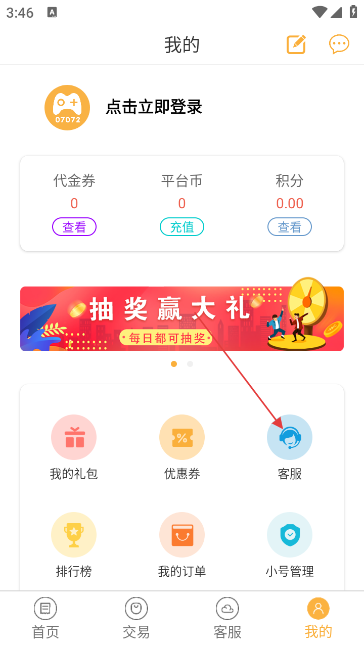 2、在【我的】頁面,可點擊【客服】選項,進入客服界面獲取幫助,也可管理代金券、平臺幣、積分等資產,使用【我的禮包】等功能。