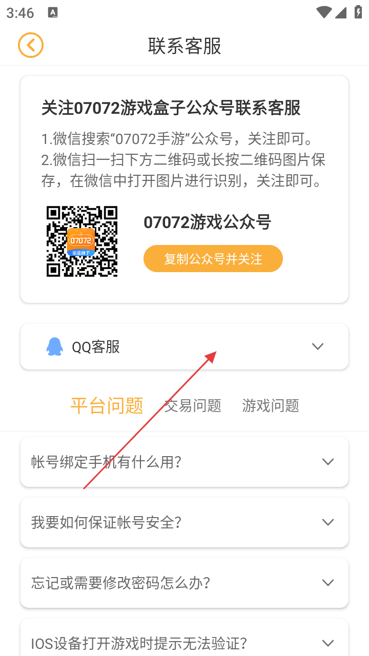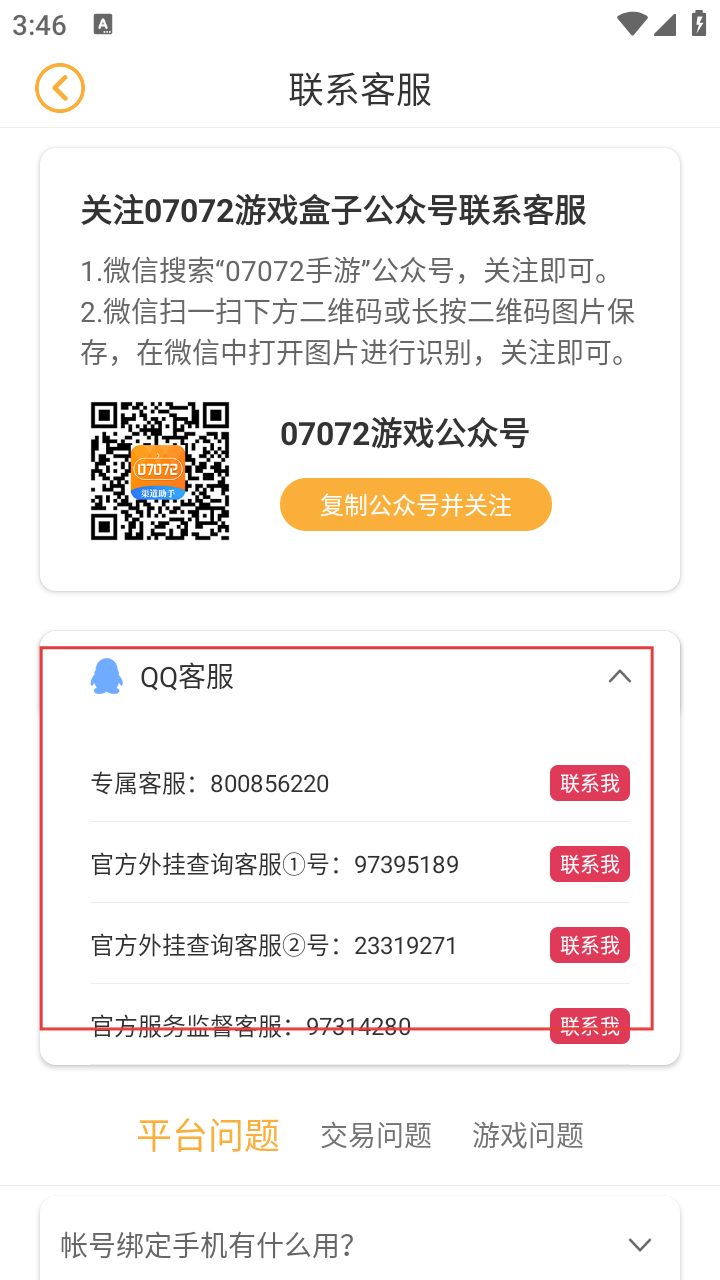 3、在聯系客服頁面,可關注【07072游戲盒子公眾號】聯系客服,也可點擊【QQ客服】展開相關客服信息,還可查看平臺、交易、游戲問題的常見解答。