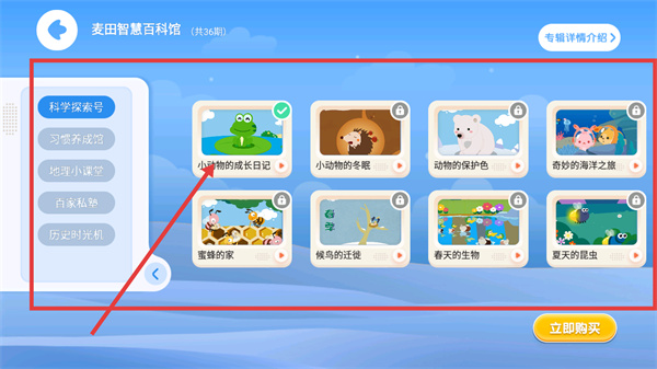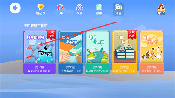 3、在動(dòng)畫板塊課程列表中,點(diǎn)擊【科學(xué)探索號(hào)】課程,進(jìn)入課程播放準(zhǔn)備頁(yè)。