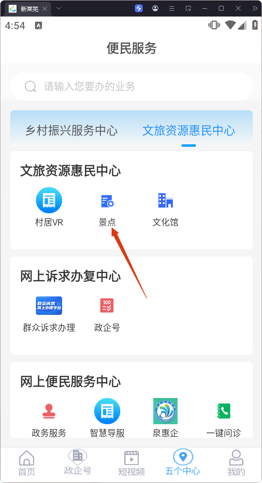 1、點(diǎn)擊底部【五個(gè)中心】,進(jìn)入便民服務(wù)頁(yè)面,可查看鄉(xiāng)村振興服務(wù)中心、文旅資源惠民中心等分類入口。
