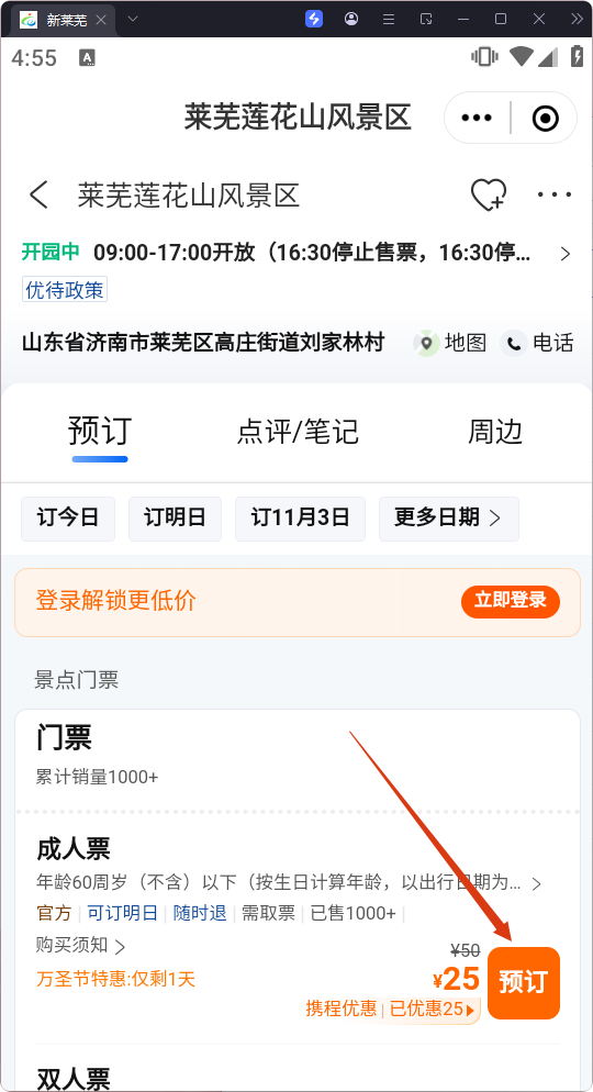 4、在景區(qū)詳情頁(yè)面點(diǎn)擊【預(yù)訂】,即可進(jìn)行門票預(yù)訂操作,享受景區(qū)游玩服務(wù)。