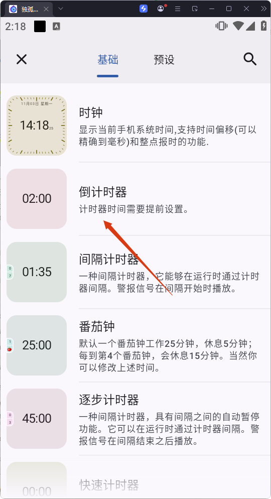 2、在基礎(chǔ)分類中選擇【倒計時器】,進入倒計時器設(shè)置頁面。