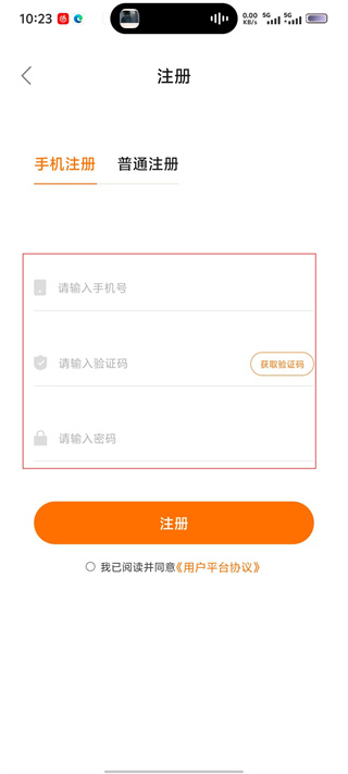 4、在賬號(hào)注冊(cè)界面,選擇手機(jī)注冊(cè),輸入手機(jī)號(hào)、驗(yàn)證碼和密碼,勾選已閱讀并同意協(xié)議后,點(diǎn)擊【注冊(cè)】按鈕,即可完成賬號(hào)注冊(cè)。