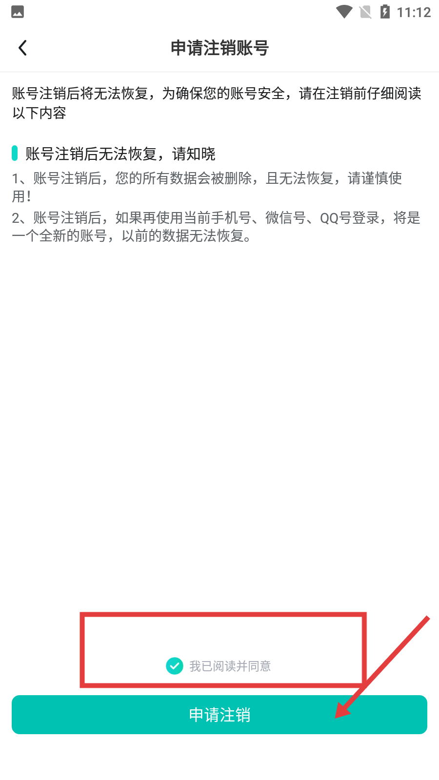 4、在【申請注銷賬號】頁面,勾選【我已閱讀并同意】后點擊【申請注銷】,即可完成賬號注銷。
