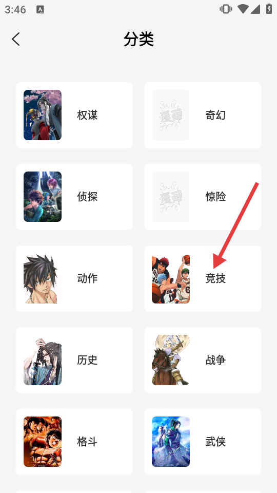 2、在分類頁面選擇【競(jìng)技】分類,進(jìn)入競(jìng)技漫畫列表頁面。