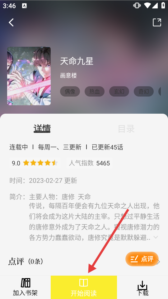 4、在漫畫詳情頁面點(diǎn)擊【開始閱讀】,即可開始閱讀《天命九星》漫畫。