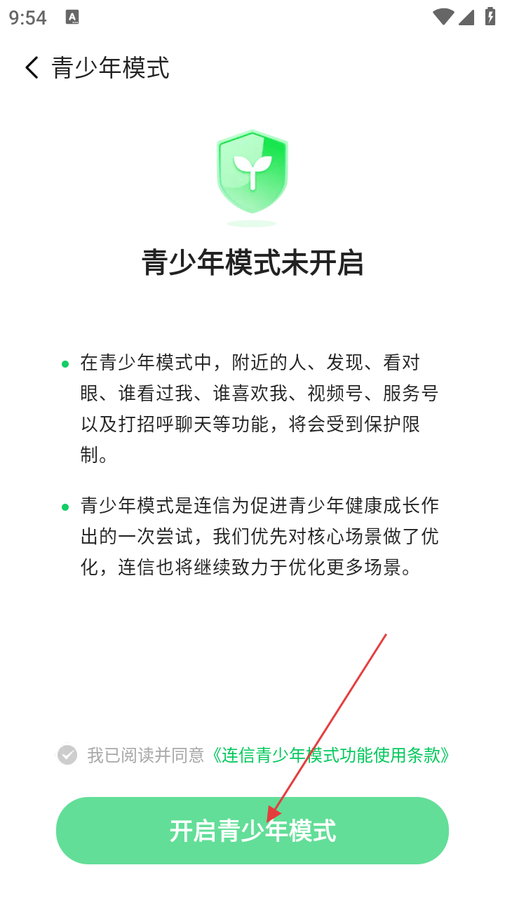 4、若需開(kāi)啟青少年模式,在青少年模式頁(yè)面勾選同意條款后,點(diǎn)擊【開(kāi)啟青少年模式】,即可限制部分功能,促進(jìn)青少年健康使用。