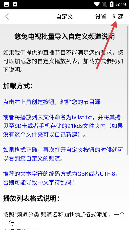 3、在自定義說(shuō)明頁(yè)面點(diǎn)擊右上角【創(chuàng)建】,進(jìn)入自定義節(jié)目源添加頁(yè)面。