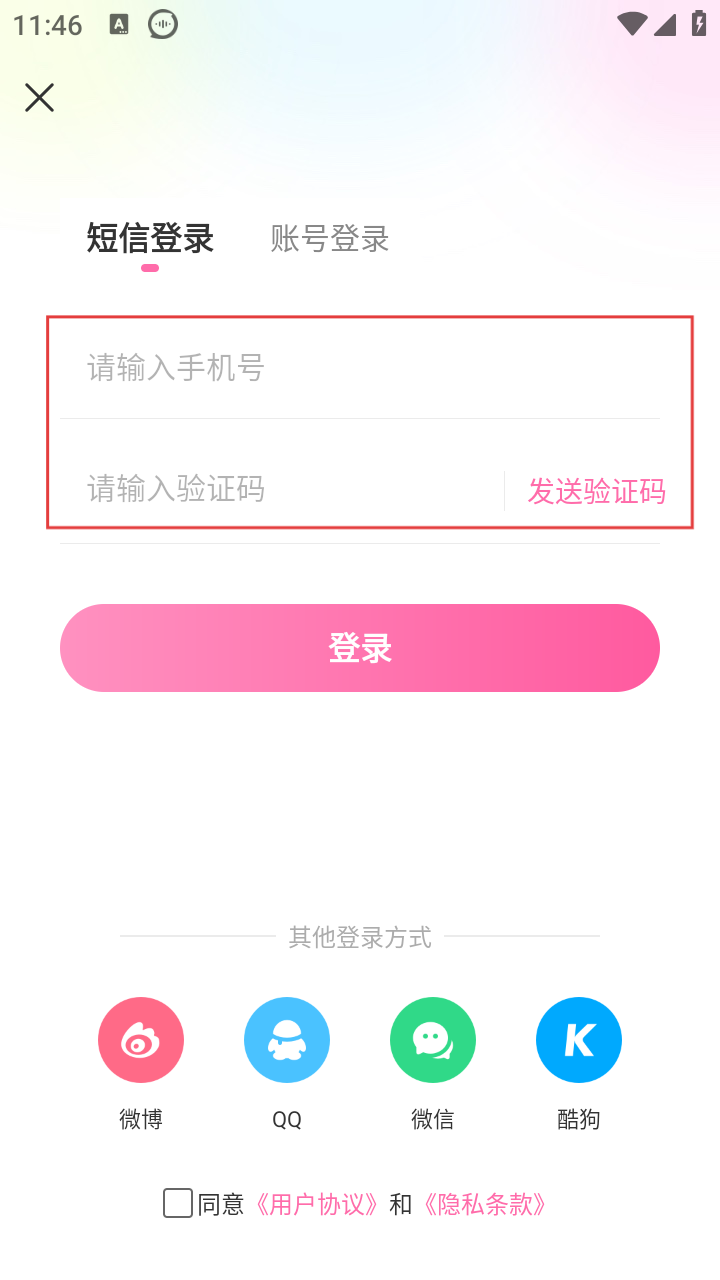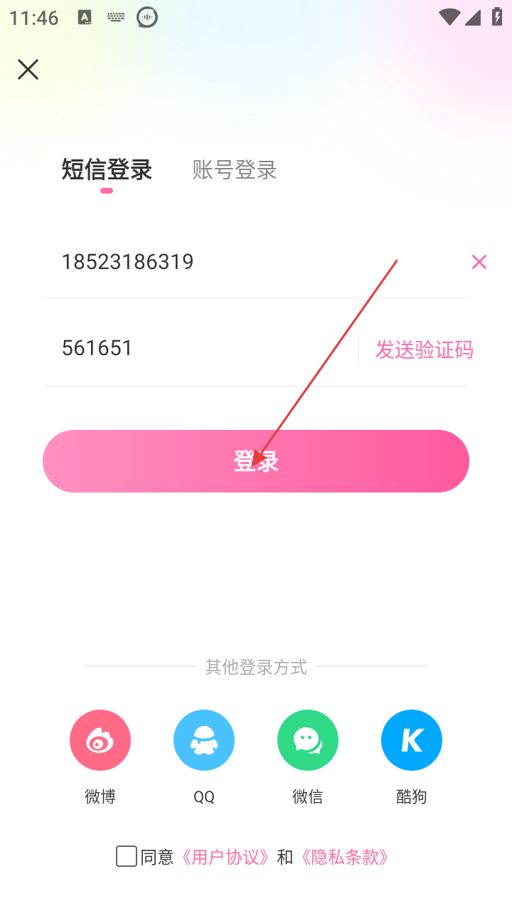3、在登錄界面,可選擇短信登錄,輸入手機(jī)號(hào)和驗(yàn)證碼,也可選擇微博、QQ、微信、酷狗等其他登錄方式。