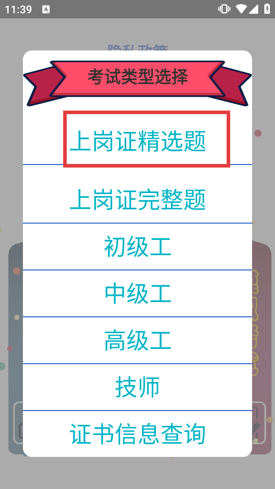 1、在考試類型選擇中點擊【上崗證精選題】,明確練習(xí)題型為上崗證精選題目。
