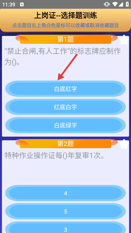 4、答題時,如第一題“禁止合閘,有人工作”的標(biāo)志牌應(yīng)選擇【白底紅字】的選項,以此方式完成后續(xù)題目作答。