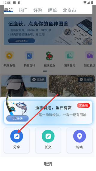 2、在釣友圈頁(yè)面點(diǎn)擊右下角分享圖標(biāo),彈出分享選項(xiàng)框。