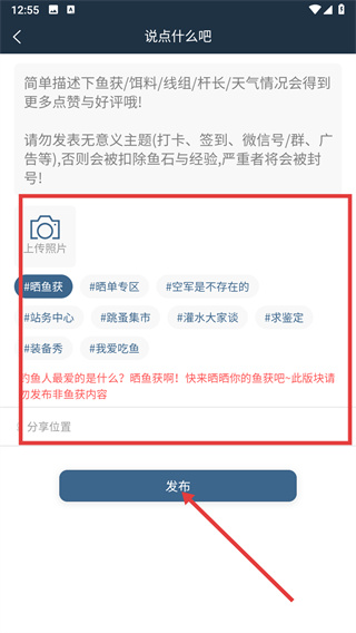 4、在內(nèi)容編輯頁(yè)面填寫(xiě)魚(yú)獲等信息、選擇話題后,點(diǎn)擊【發(fā)布】,完成動(dòng)態(tài)分享。