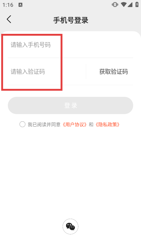 3、在手機(jī)號(hào)登錄頁(yè)面填寫(xiě)手機(jī)號(hào)碼和驗(yàn)證碼,準(zhǔn)備完成登錄操作。
