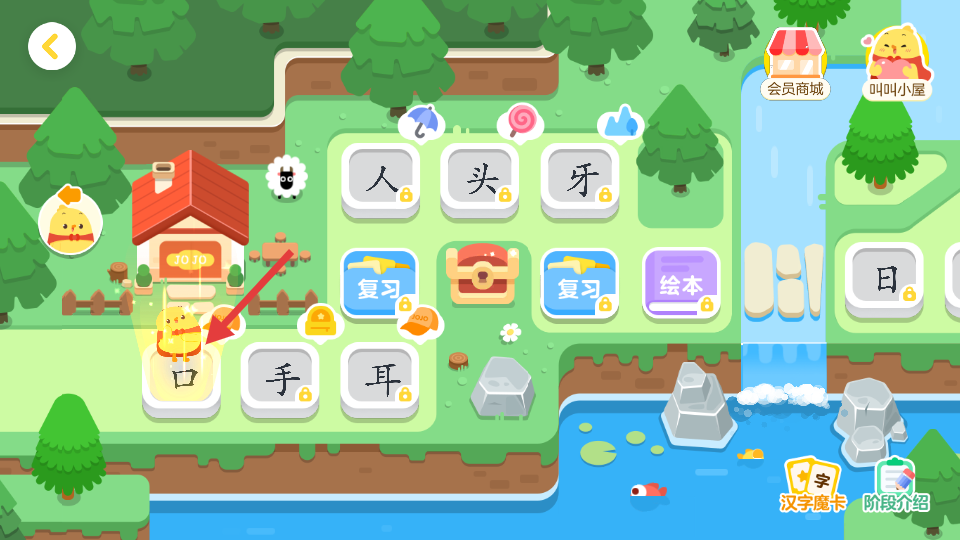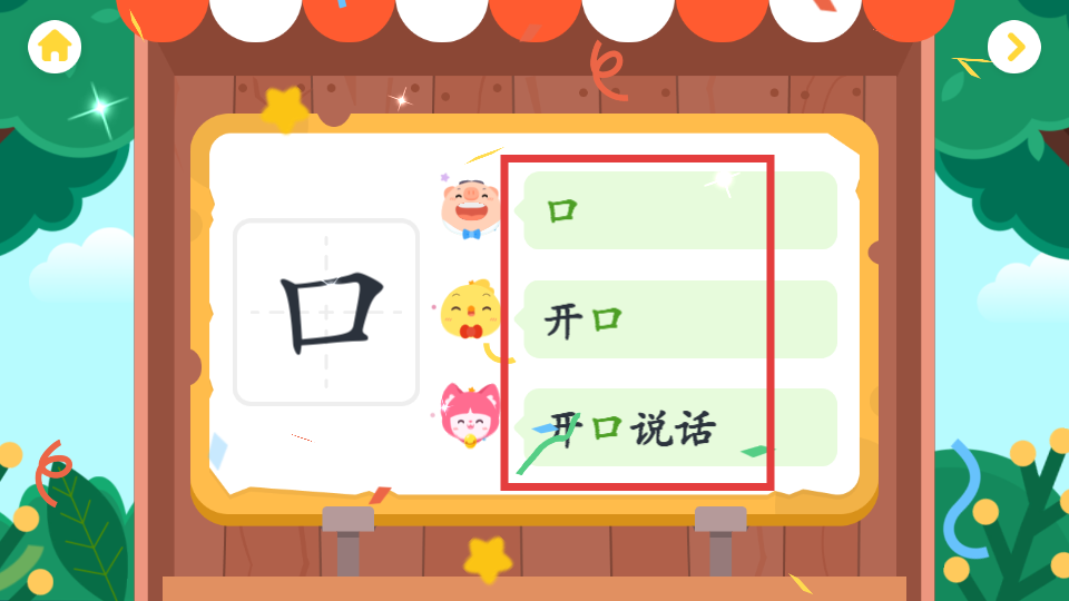 1、點(diǎn)擊【口】字模塊,進(jìn)入“口”字學(xué)習(xí)頁面,開啟漢字學(xué)習(xí)流程。