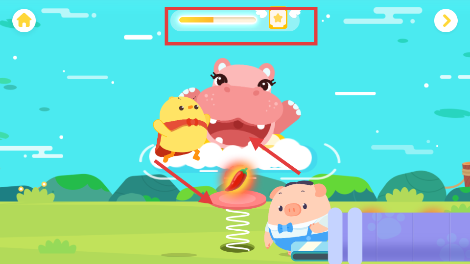 3、參與互動游戲,如將辣椒彈入河馬口中,通過游戲強(qiáng)化對“口”字含義的理解,同時關(guān)注進(jìn)度條,跟蹤學(xué)習(xí)進(jìn)度。