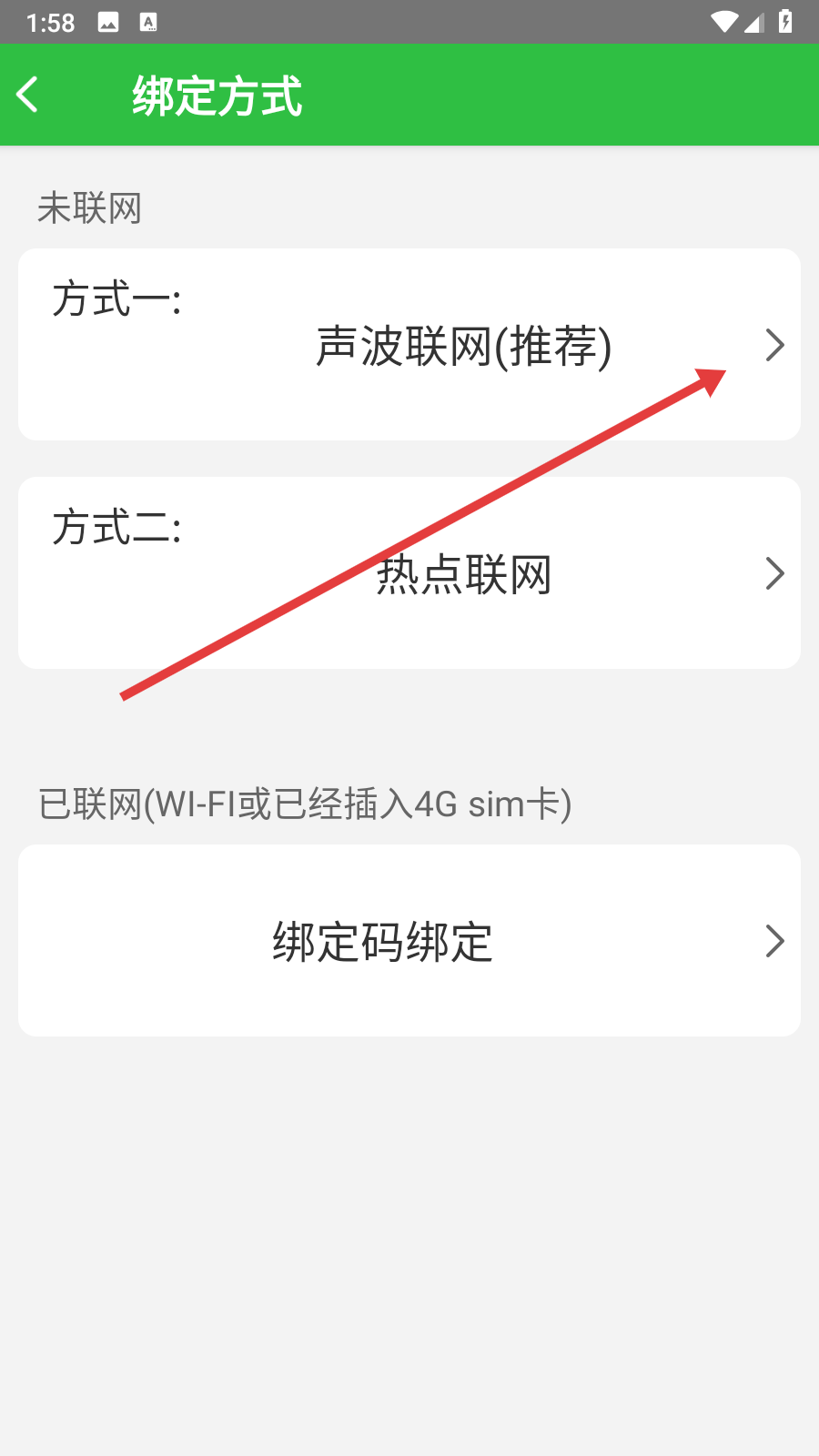 2、在綁定方式頁面點(diǎn)擊【聲波聯(lián)網(wǎng)(推薦)】,進(jìn)入給機(jī)器人設(shè)置Wi-Fi頁面。