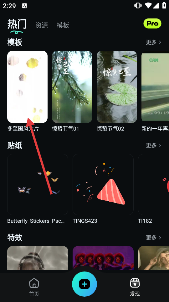 1、點(diǎn)擊底部【發(fā)現(xiàn)】,進(jìn)入模板資源頁面,瀏覽熱門模板、貼紙、特效等資源。