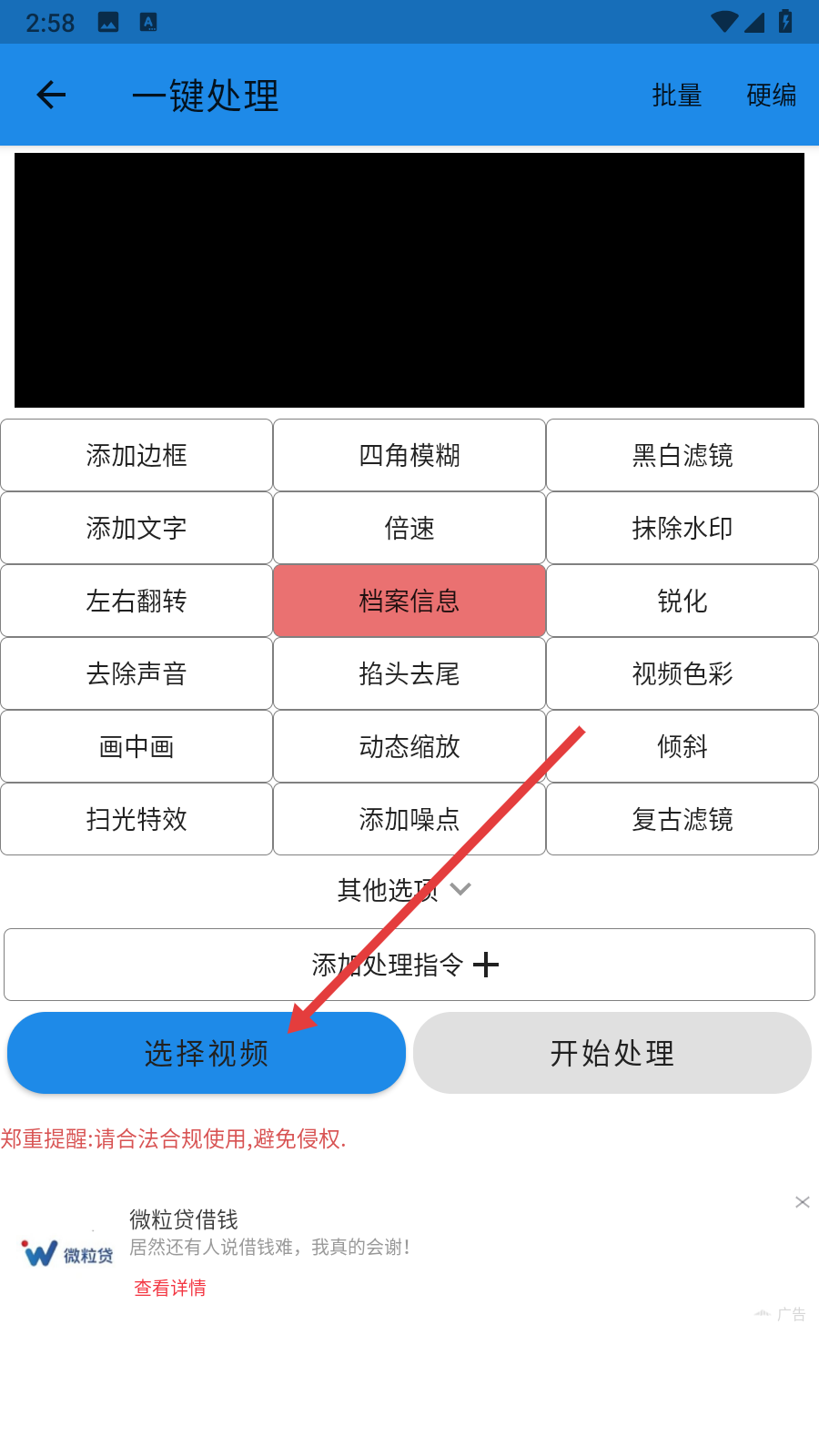 2、在一鍵處理頁(yè)面選擇處理的要求后,點(diǎn)擊【選擇視頻】。