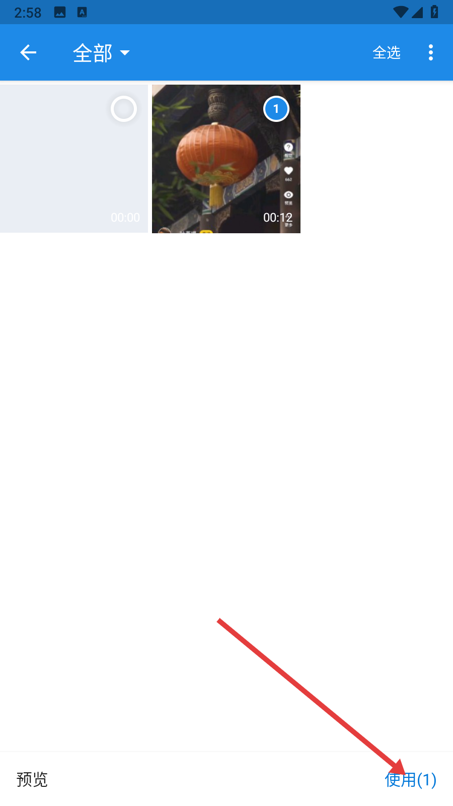3、在視頻選擇頁(yè)面選擇目標(biāo)視頻后點(diǎn)擊【使用】,返回一鍵處理頁(yè)面。