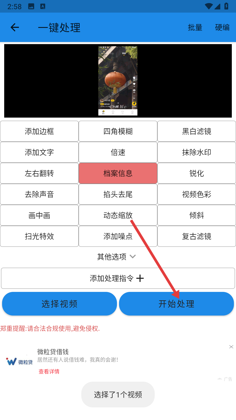 4、在一鍵處理頁(yè)面點(diǎn)擊【開始處理】,完成視頻的一鍵處理流程。