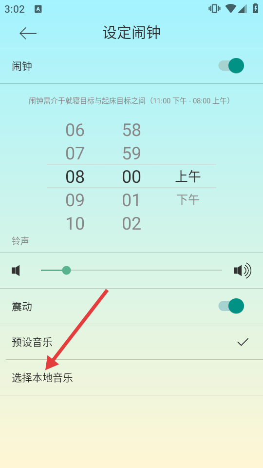 3、在設(shè)定鬧鐘頁(yè)面點(diǎn)擊【選擇本地音樂(lè)】,進(jìn)入本地音樂(lè)選擇界面。